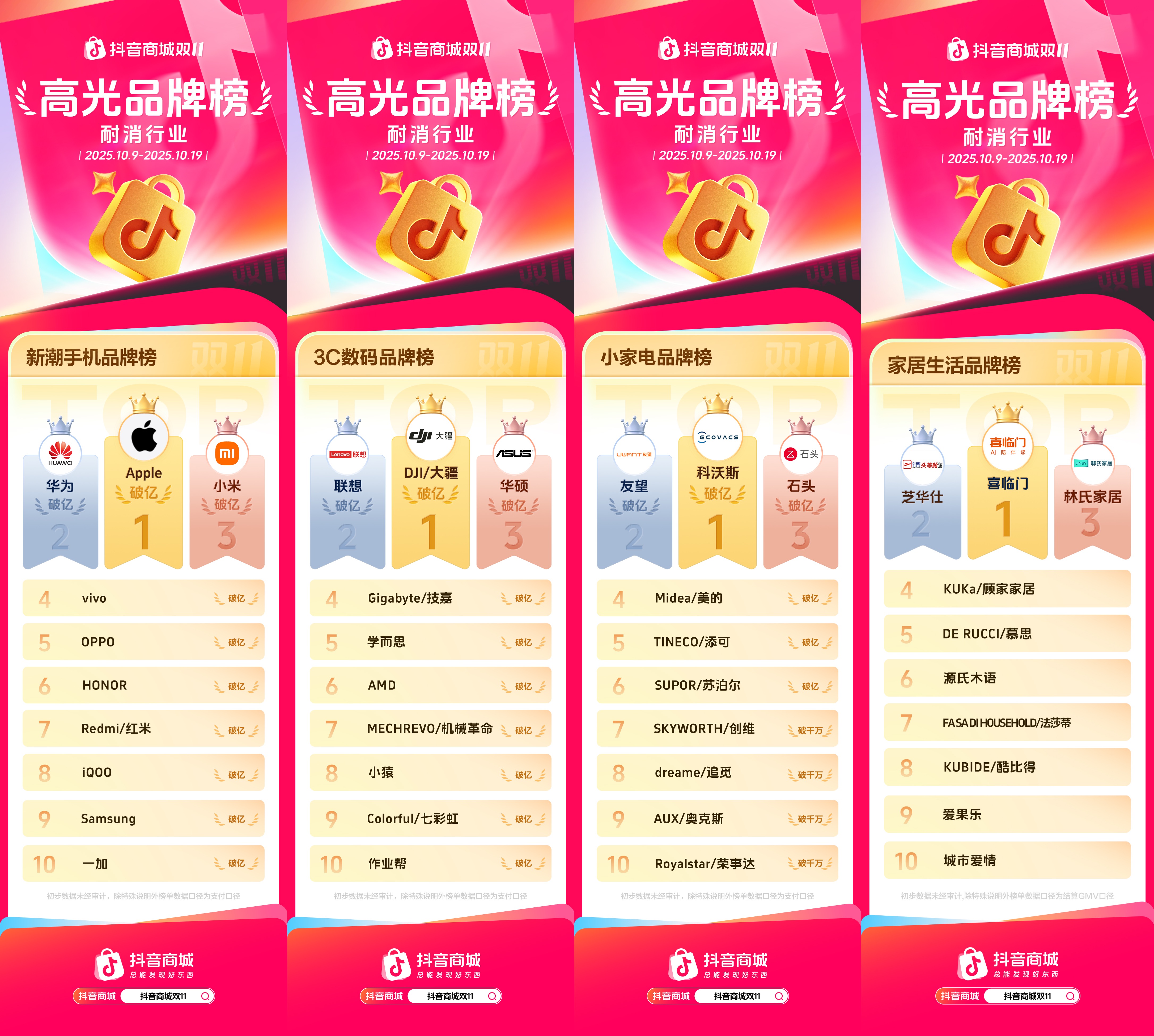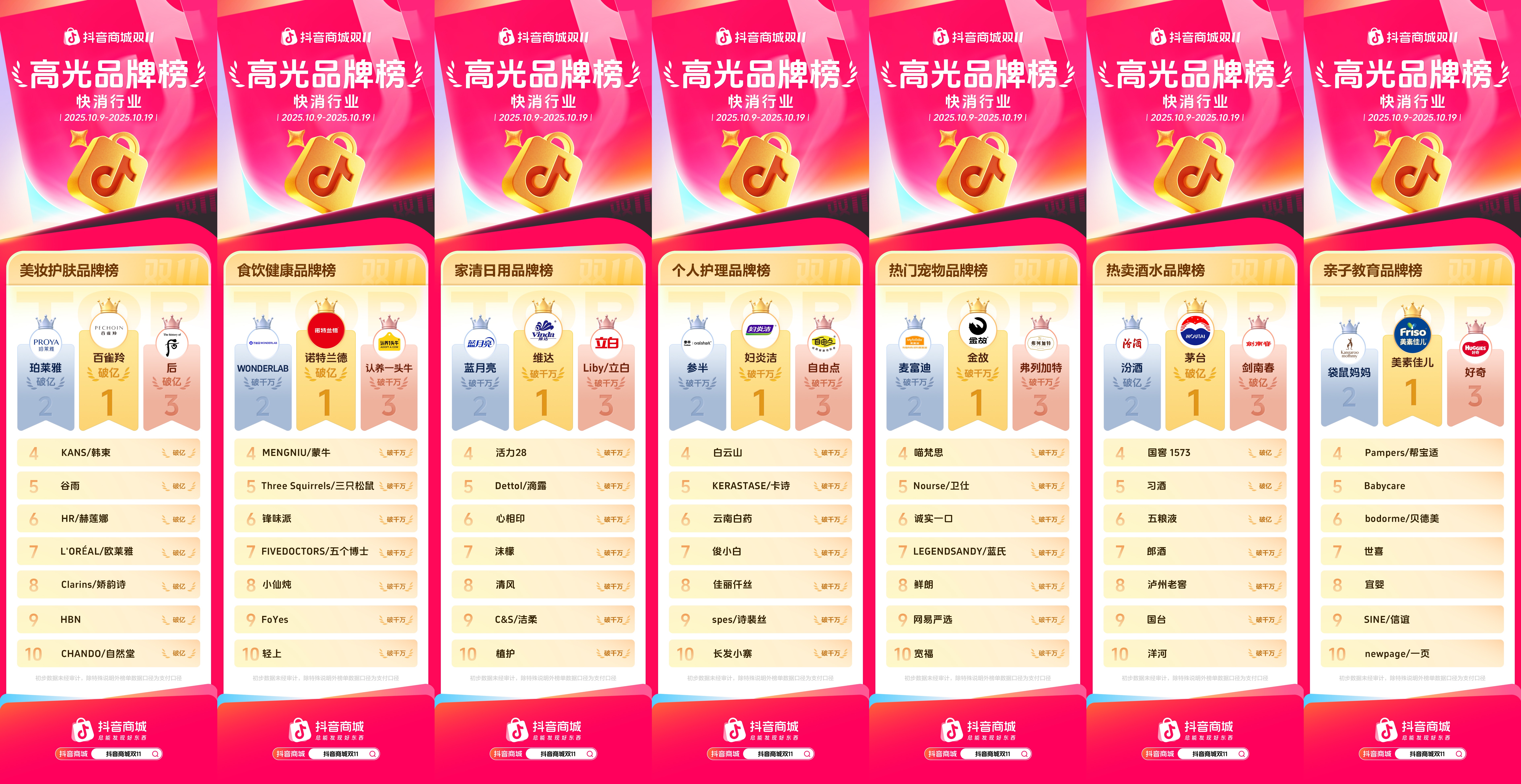 10月21日,抖音电商发布双11高光品牌榜单,截止到10月19日,众多行业品牌成果亮眼。在服饰行业,运动户外品牌榜TOP10销售额集体破亿,骆驼、斐乐、耐克表现卓越位列前三;女装破亿品牌涌现,鸭鸭、波司登、AP占据时尚女装品牌榜前三,红人品牌增势喜人,LucasEmilyLouie、美洋等品牌紧跟其后;罗蒙、啄木鳥、皮尔·卡丹等男装品牌销售额破亿,位列趋势男装品牌榜前三。 珠宝和奢侈品品类消费热度持续攀升,黄金成为消费者心头好,珠宝首饰品牌榜TOP10中领丰金、厚德金、中国黄金占据前三位;心动奢侈品牌榜由Ralph Lauren拉夫劳伦、ICICLE之禾、HugoBoss 雨果博斯领跑。 |服饰行业高光品牌榜 ![]() 快消品囤货需求旺盛,美妆、食饮健康、家清日用、个护、宠物、酒水、亲子教育等快消品牌销售额大幅提升,消费潜力被充分释放。 美妆仍是双11重点囤货品类,百雀羚、珀莱雅、THE WHOO占据美妆品牌榜TOP3;养生健康类食品愈发受到用户重视,膳食营养补充剂品牌诺特兰德位列食饮健康品牌榜TOP1;维达、妇炎洁分别位居家清日用、个人护理品牌榜首;宠物新锐品牌金故领跑位居热门宠物品牌榜榜首;茅台、汾酒、剑南春等白酒品牌销售额破亿,位居榜单前列;亲子教育行业头部品牌势头强劲,美素佳儿夺得亲子教育行业品牌榜TOP1。 |快消行业高光品牌榜 ![]() 越来越多的消费者习惯在抖音商城下单手机、3C数码、小家电、家居生活等耐消产品,各细分行业品牌收获生意增长。其中,手机、3C数码品牌榜TOP10销售额均破亿,苹果、华为、小米占据新潮手机品牌榜三甲;大疆、联想、华硕名列3C数码品牌榜前三;小家电品牌榜中,科沃斯、友望、石头斩获TOP3;喜临门、芝华仕和林氏家居位列家居生活品牌榜前三。 |耐消行业高光品牌榜 ![]() 抖音电商双11大促火热氛围下,消费者的购买力不断被激活,商家生意成果也不断被刷新。平台将持续通过流量扶持、曝光激励、物流保障等举措,全方位助力商家大促经营,把握大促商机,实现双11生意稳步攀升。